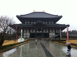 雨のなか結構歩きました。東大寺大仏殿は何度見ても圧巻です。聖武天皇により天平に創建された大仏殿は今より30mほど幅が広く、左右には100m近い7重の塔が建っていたそうです。大仏殿のなかに昔の大仏殿の模型がありますが、縦横のバランスも安定感があり、デザインもシンプルでかっこいい。さらに100m近い7重の塔。焼けてしまった事が本当に残念。実物を見てみたかったですね。