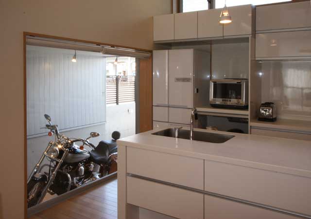 キッチンからはバイクガレージを見る事が出来ます。